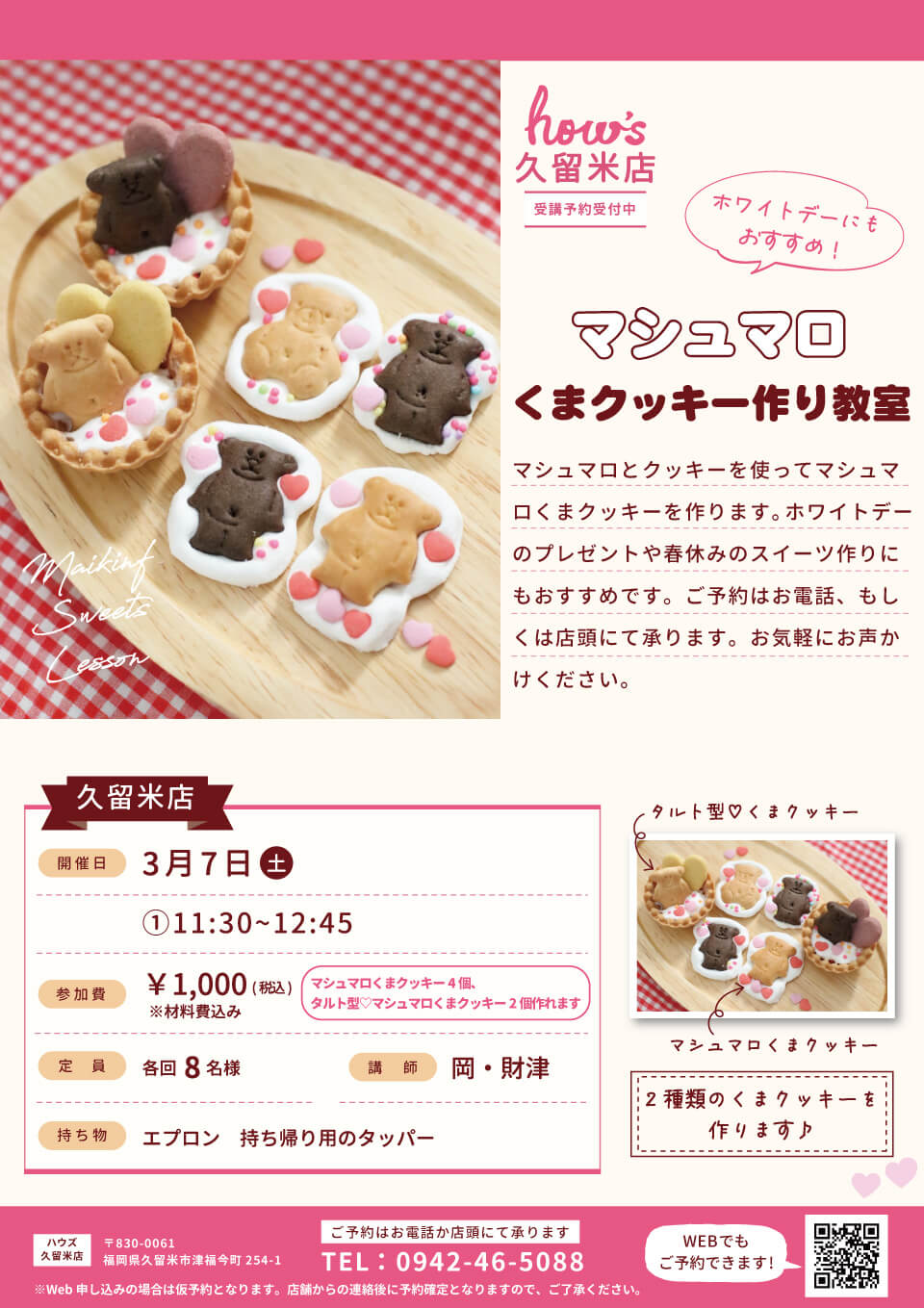 ハウズ 久留米店 マシュマロくまクッキー作り教室 ハウズ久留米店ではワークショップやお料理、お花など各種教室を開催しております! 親子でなにかやってみたい!自分の特技になるようなことを習いたい!という方! ぜひ、ご参加ください!初めての方も大歓迎です! 店舗情報 〒830-0061 福岡県久留米市津福今町254-1 Tel: 0942-46-5088 営業時間: 10:30~19:30 地図 取り扱い商品 国内・海外化粧品、オーガニック化粧品、ファッション、ファッション雑貨、キッズ、キッチン・バス用品、インテリア雑貨、ステーショナリー、ガーデニンググッズ、直輸入雑貨 他多数 ※大型店舗 SNS PAGE TOP ×