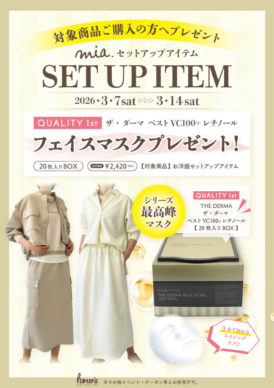 対象のSET UP ITEMをご購入いただいた方へ、QUALITY 1STのフェイスマスクをプレゼントいたします💕