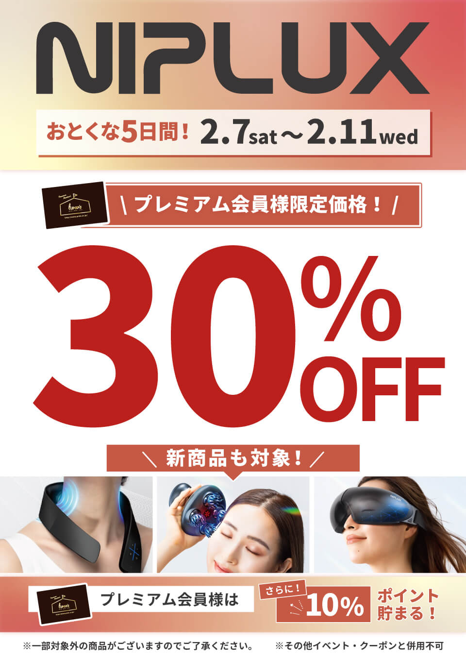 2/7(土)~2/11(水)までの5日間限定‼️NIPLUXがプレミアム会員様限定で30%OFFとなります😲⚡