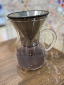 耐熱ガラス製カラフェにステンレスフィルター(プラスチック製タイプは紙フィルター使用)をセットし、コーヒーの粉(中挽き)を直接入れてドリップします😊