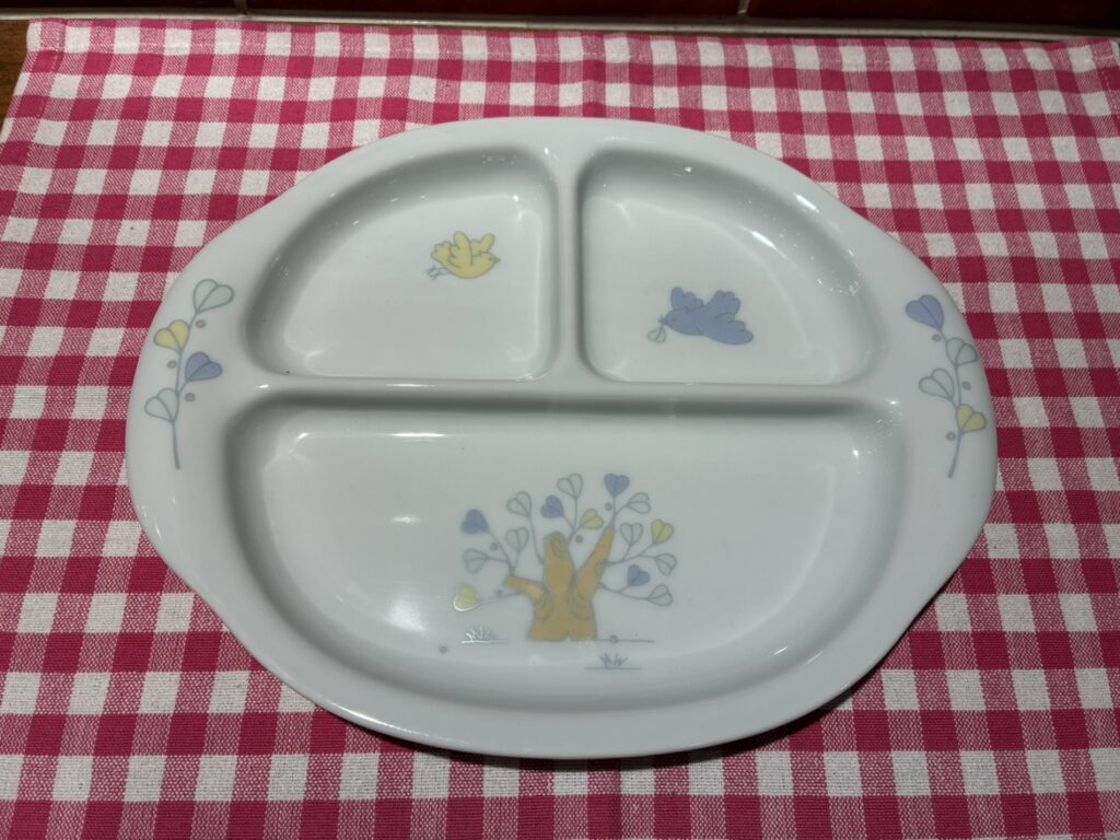 3つの仕切りがついたプレートは、食材が混ざらず盛りつけもきれい。離乳食期から幼児食まで幅広く活躍します。白磁の美しさと、丸みのあるフォルムが食卓をやさしく彩ります。